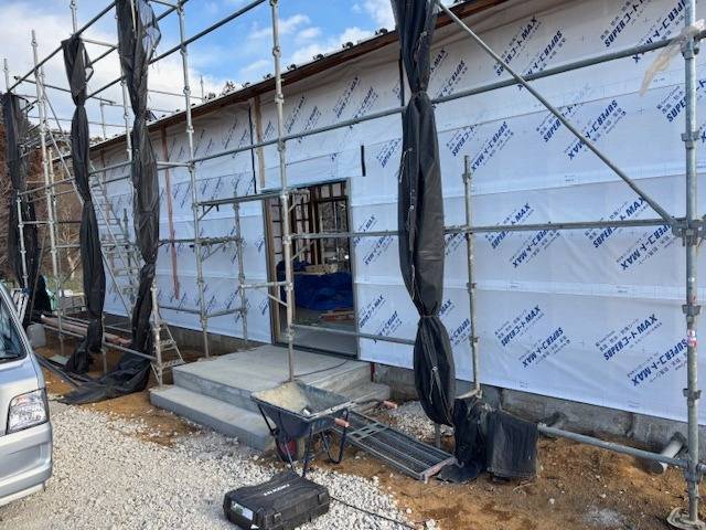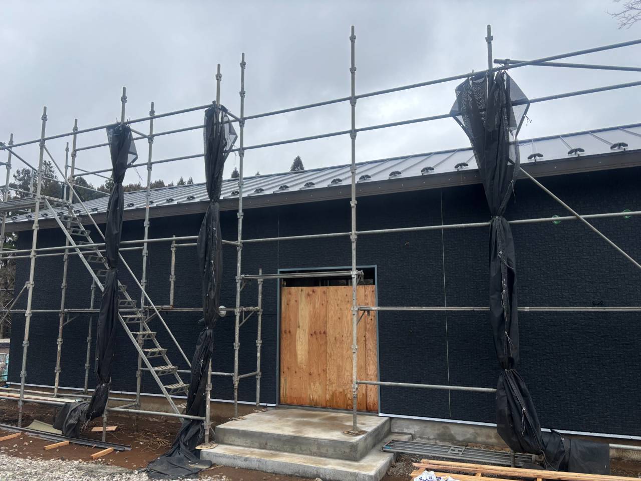 この外壁の通りを補正し、更に内外の外壁の垂直方向に対しては、直角(矩形)でない為、横胴縁を通して、垂直を補正しました。