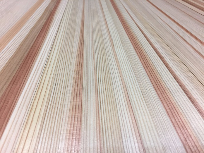 杉も例外でなく、成長が早かった年輪は通常5mm以上ありますが、歳をとった材料の年輪は2mm以下となり緻密で、少しくすんだ赤色の印象となります。