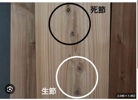 節は枝の心材部分の切断面に発生します。この心材が取れたものや取れそうなものを死に節といい、取れそうもないものを生き節と言います。
