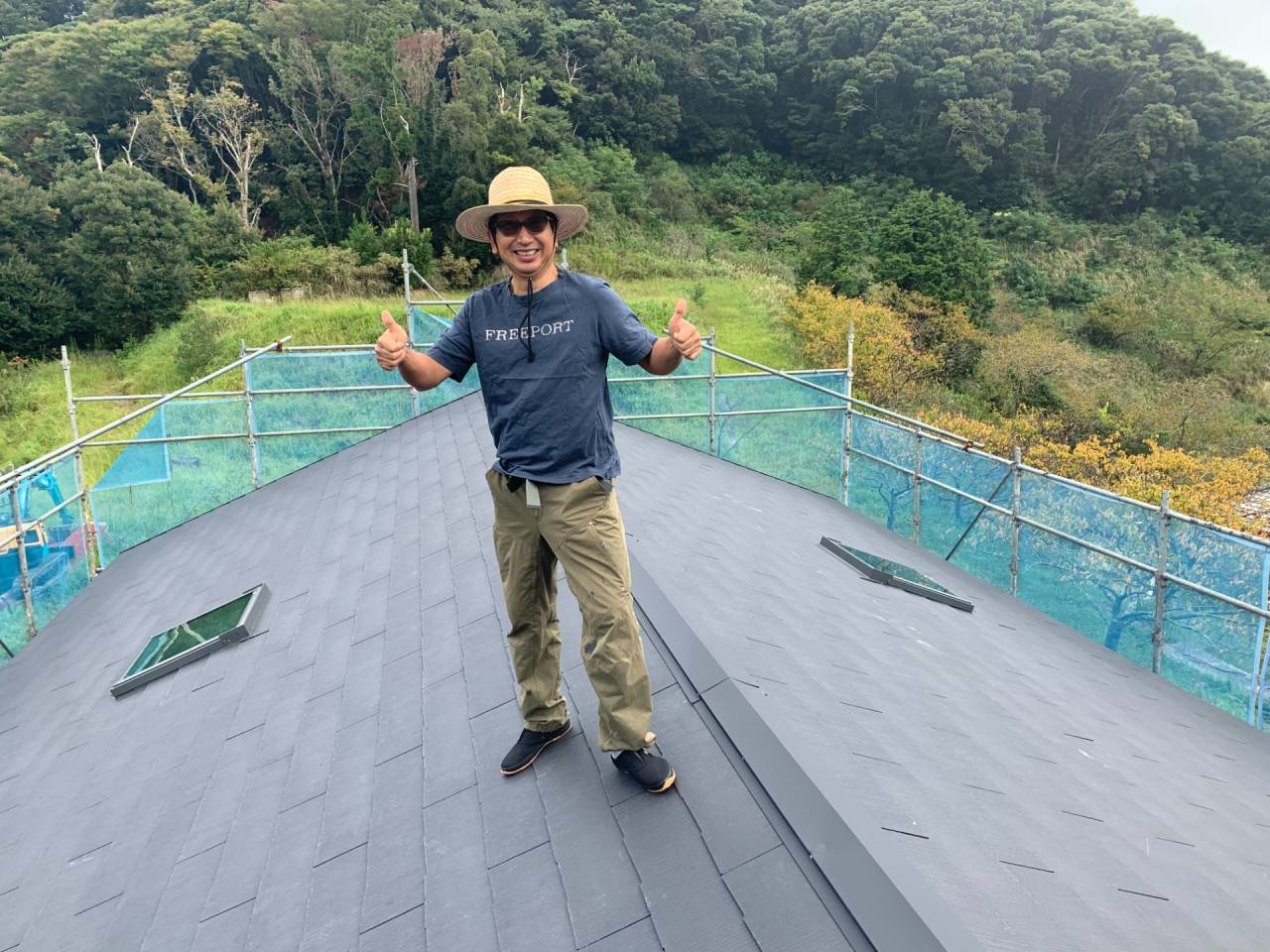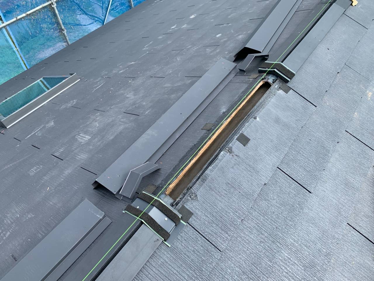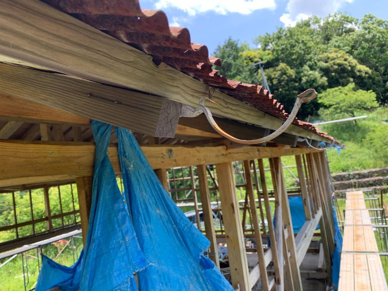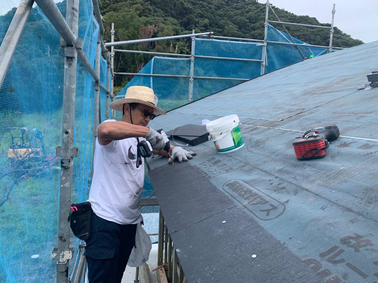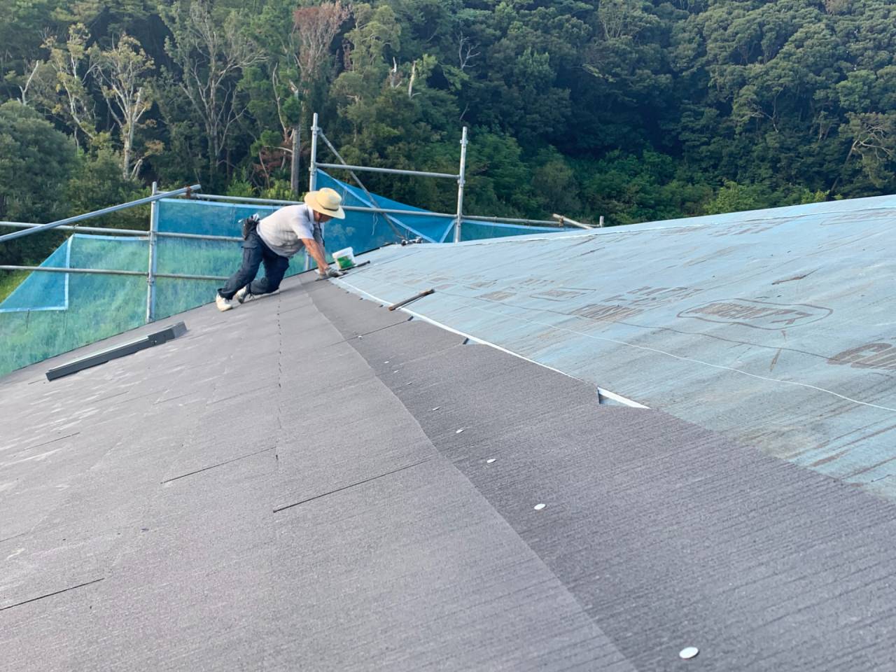 夏からは着工しましたので、炎天下の中、屋根の野地板改修から、コロニアル葺き作業からこのプロジェクトは始まりました。