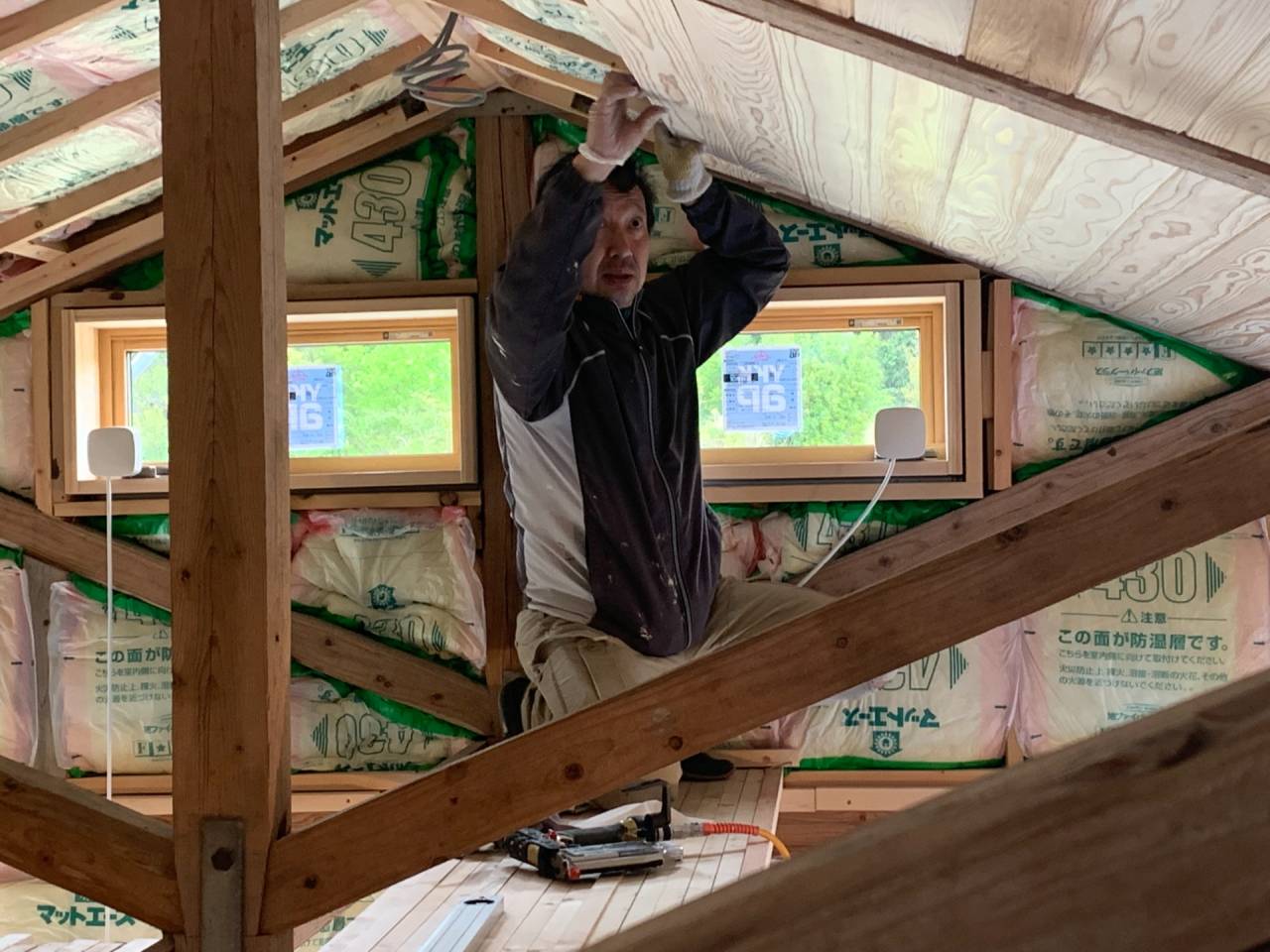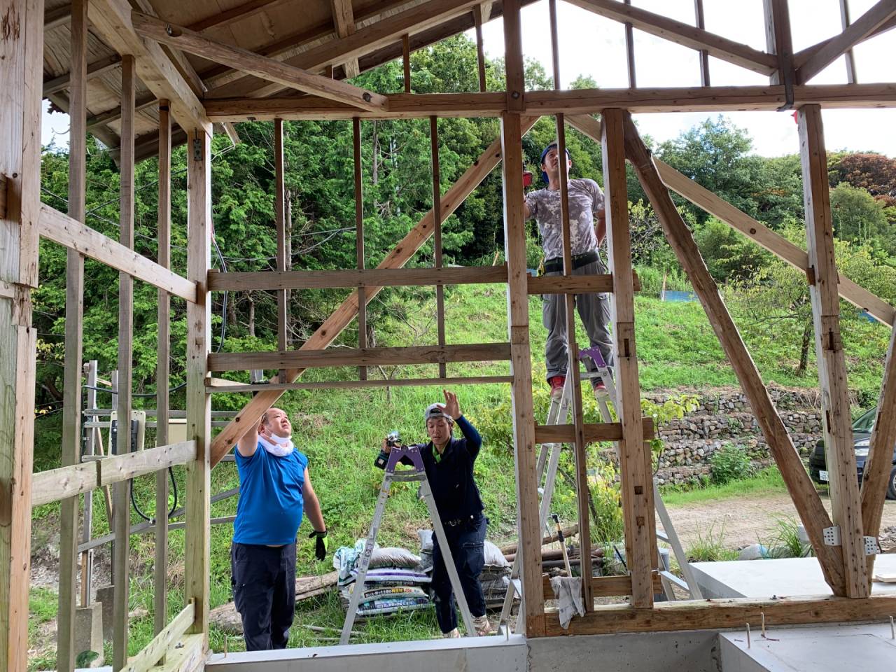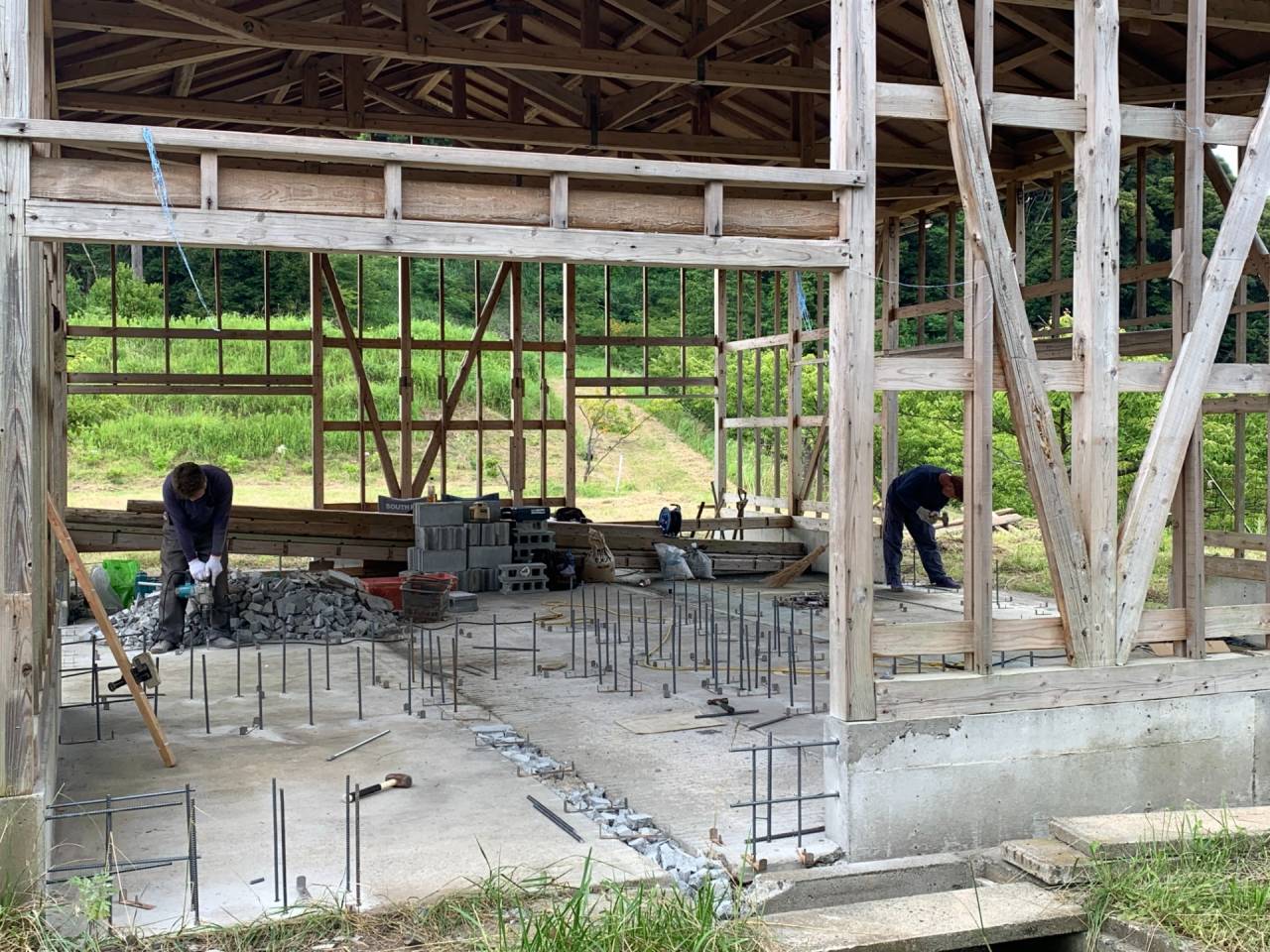 60代初期の男性(医薬品等の貿易会社経営者)がDIYサポートの共同作業で、牛小屋から、住宅に改修する作業の風景です。