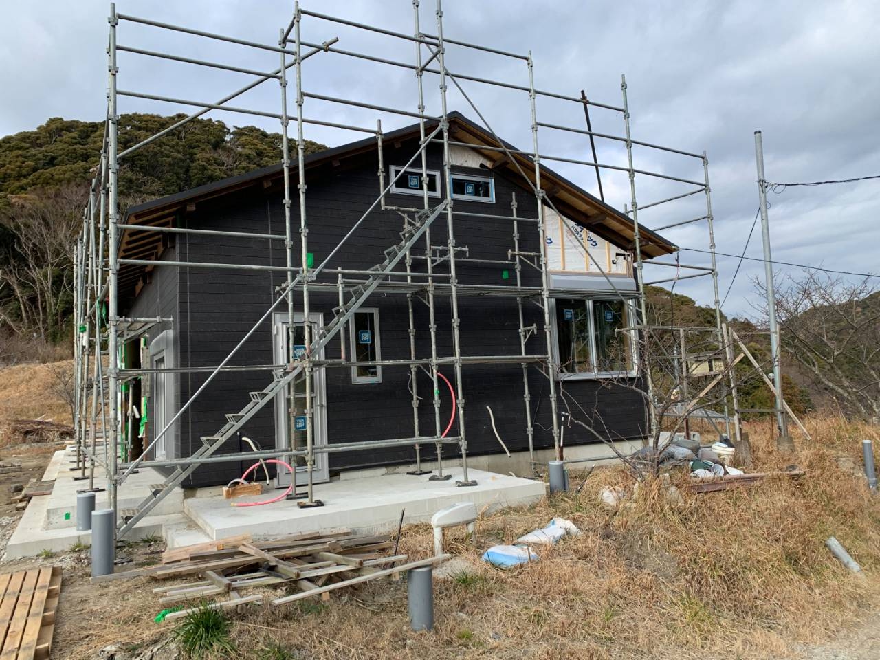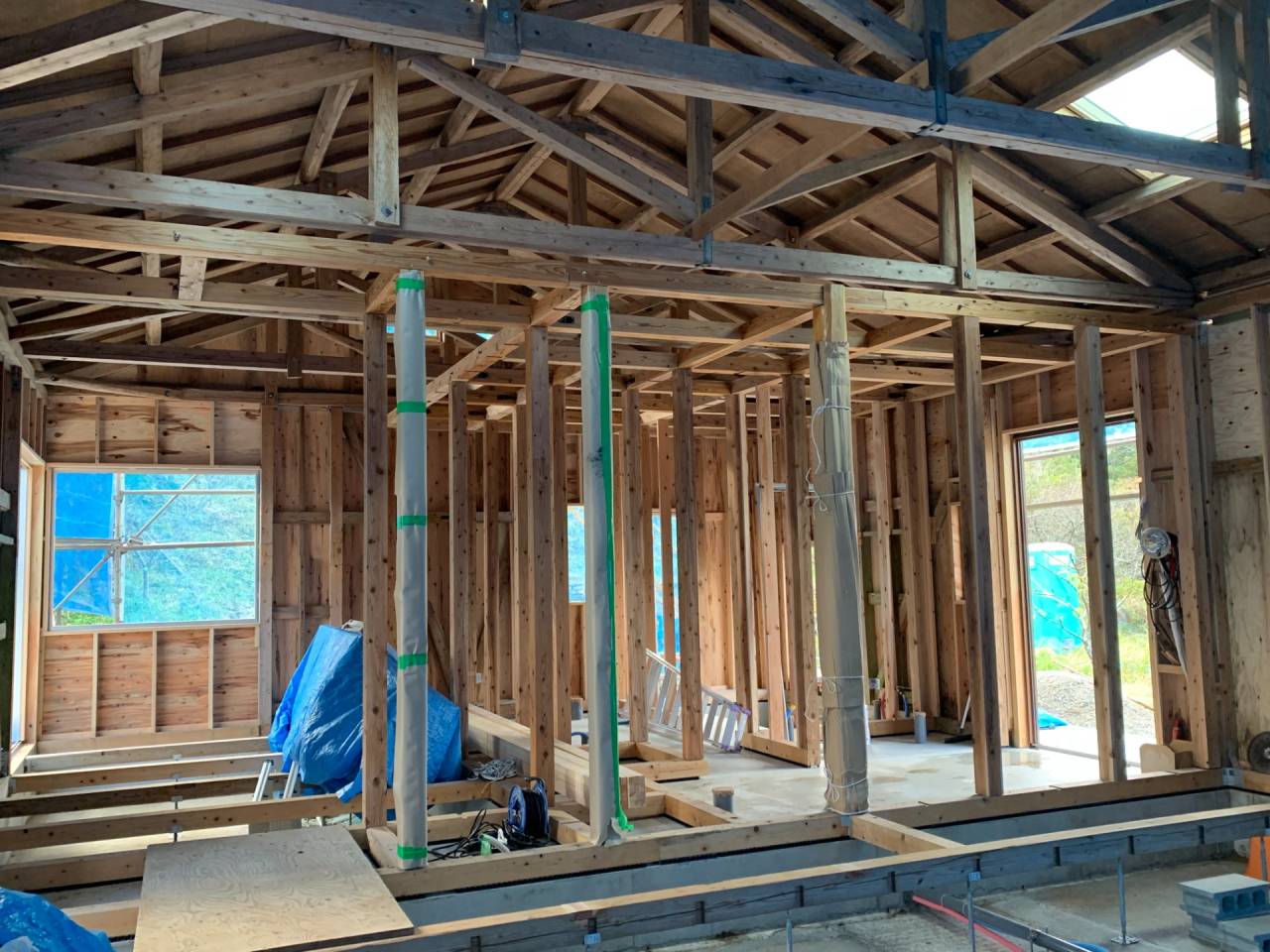 現場は小高い山頂にポツンとあり、風圧が心配でしたので、外壁に構造用合板を張り揺れを抑え、屋根は補修が比較的に容易なコロニアルを選択しました。