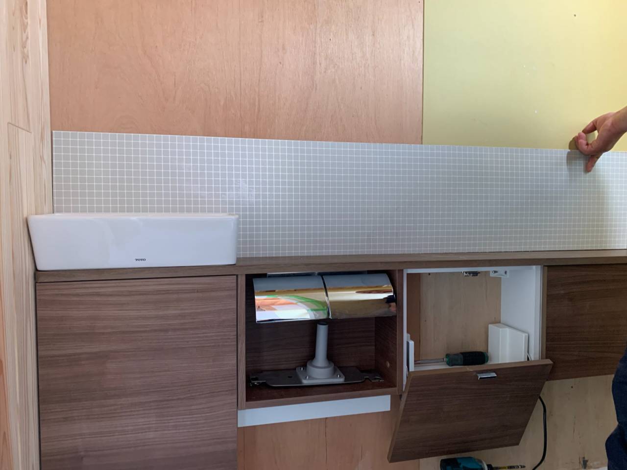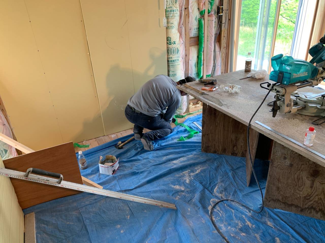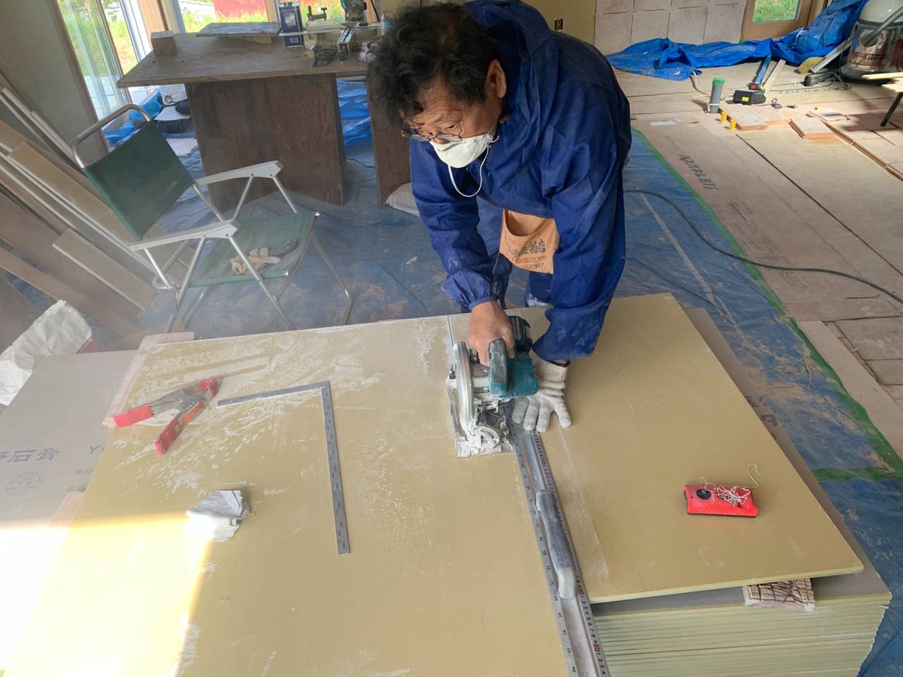 職人バッカのサポートは、石膏ボードの貼り付け作業で終了。