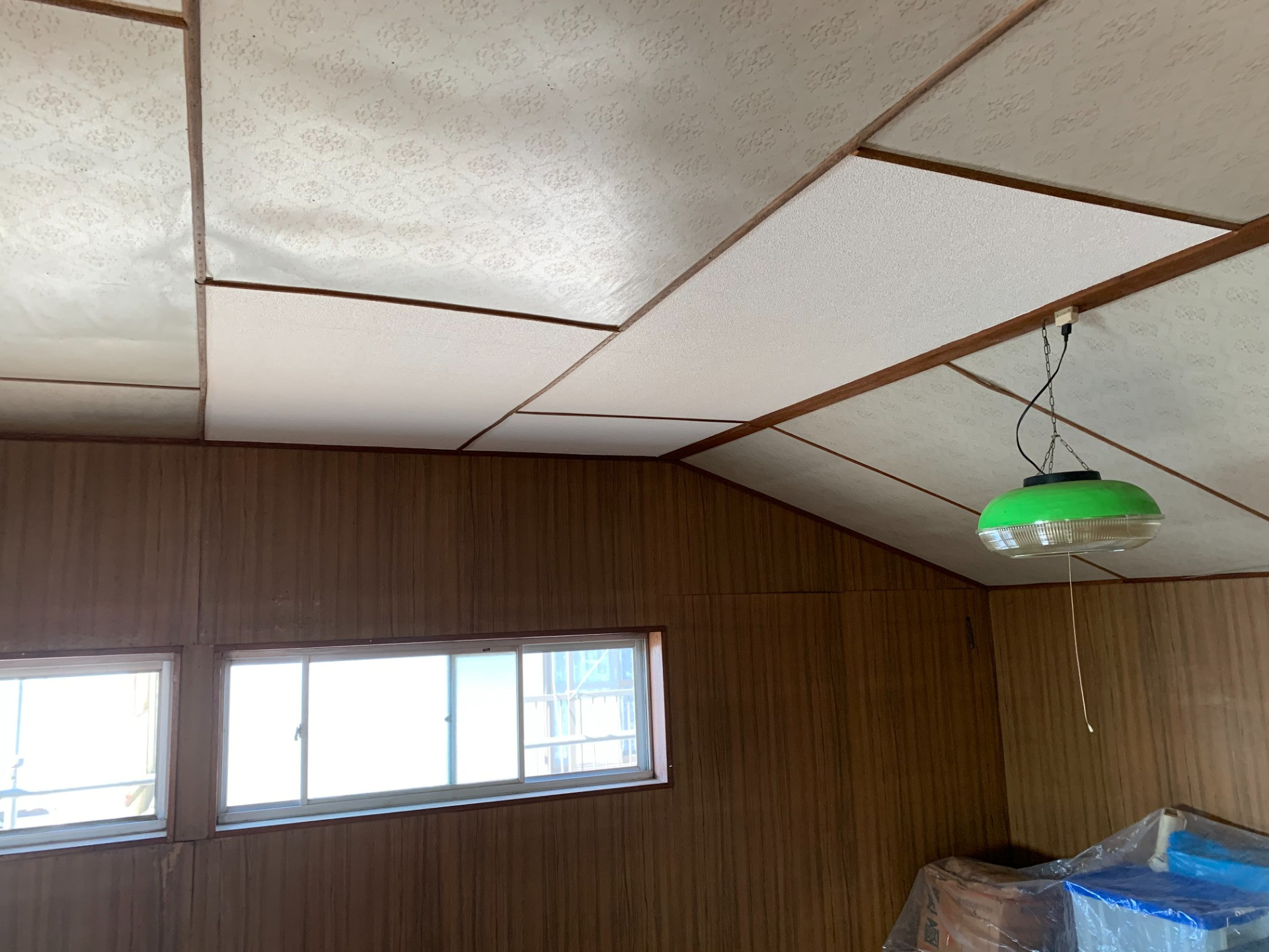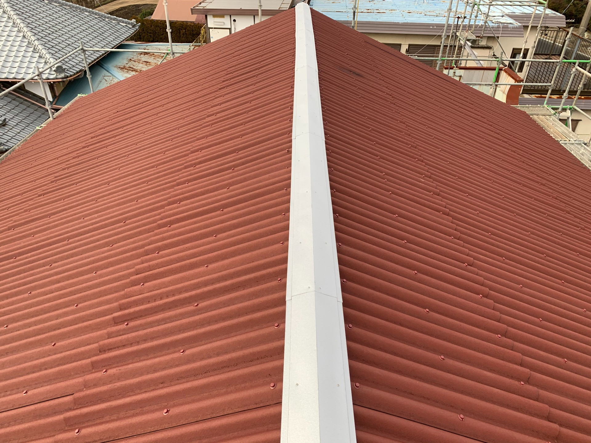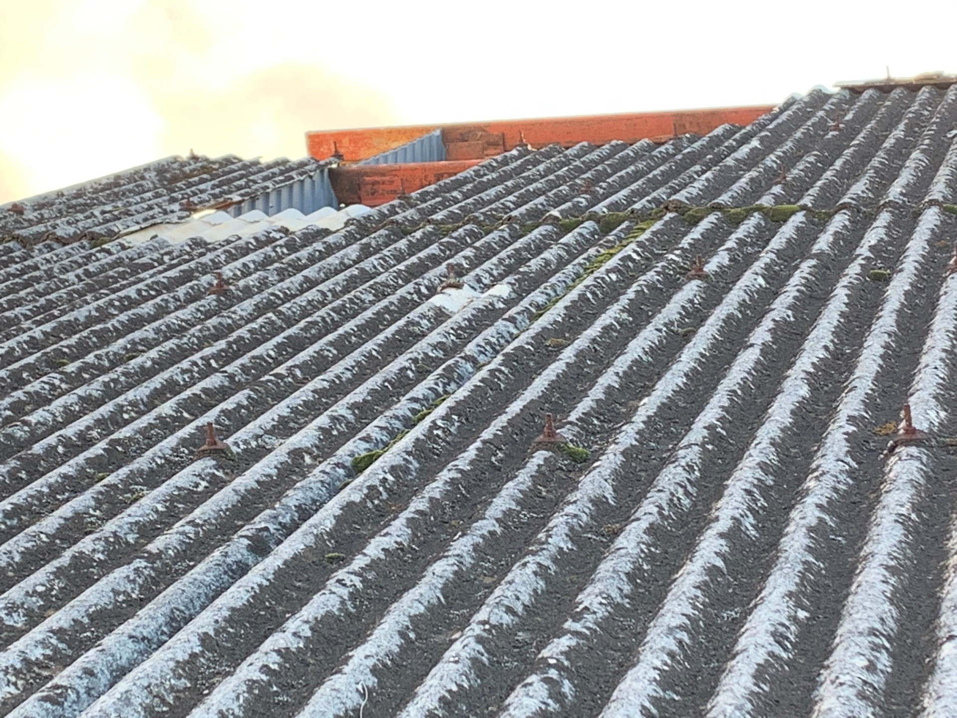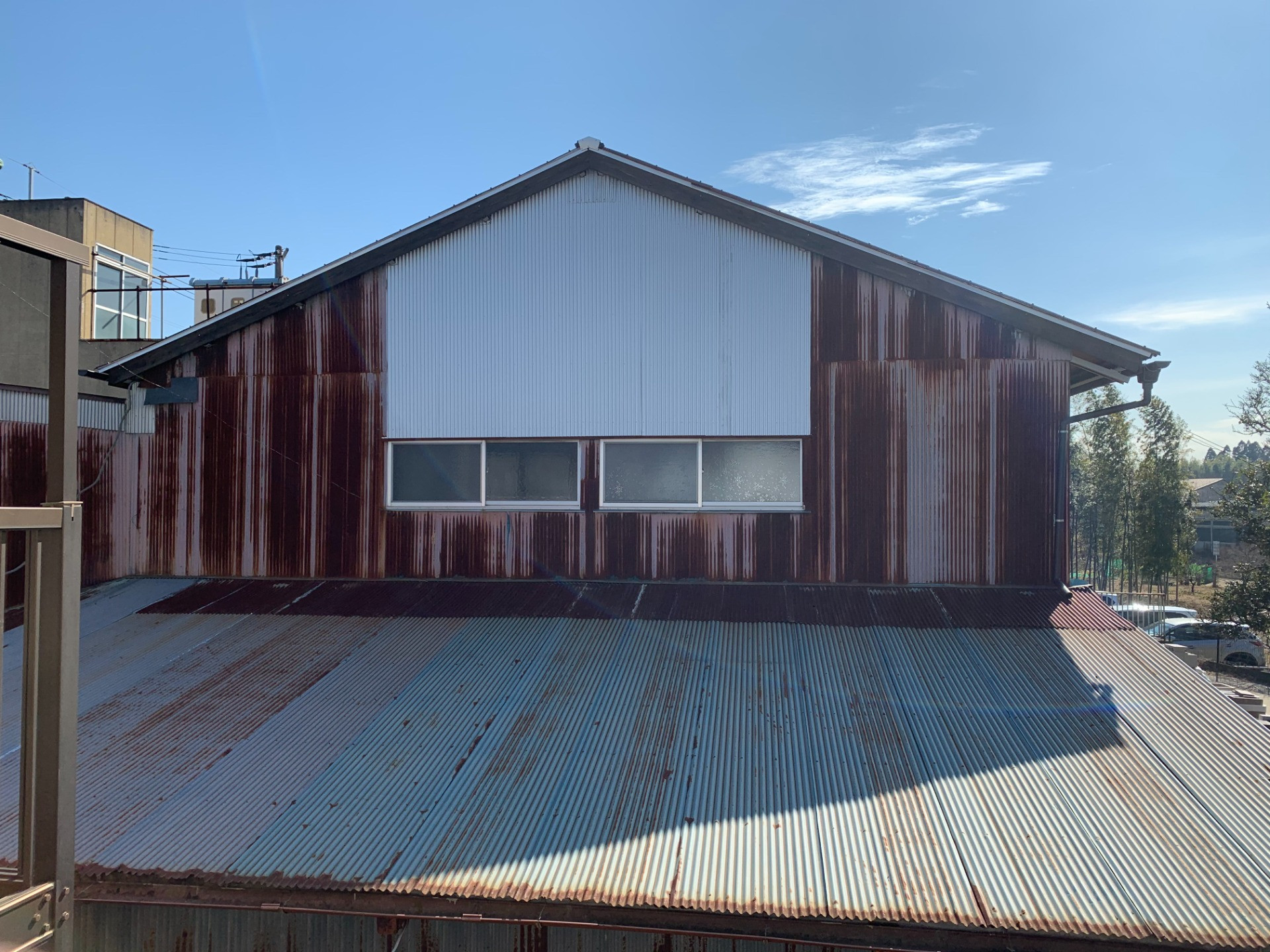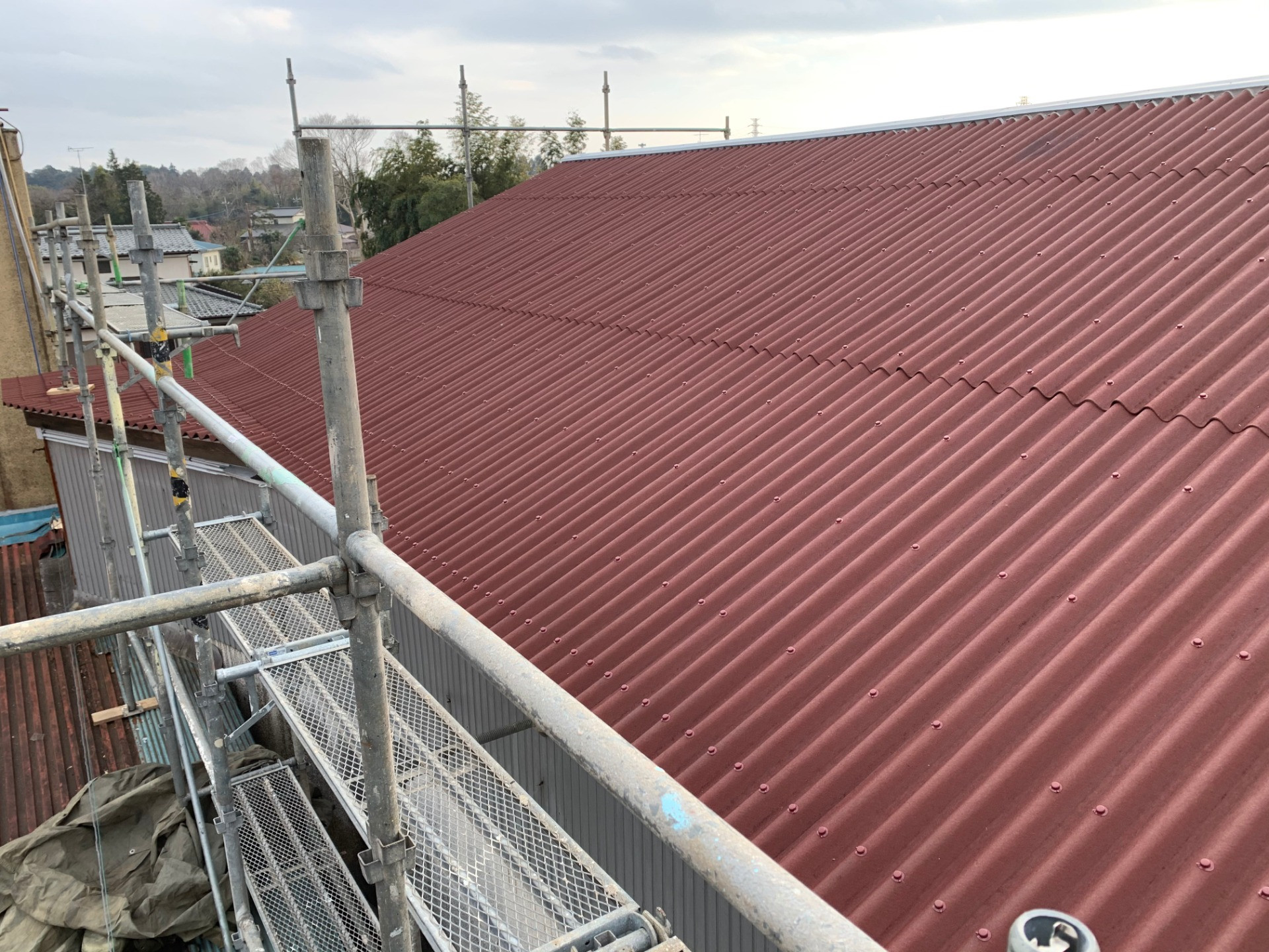 既存屋根は、石綿材の下地材無しの一発葺きで、屋根上を歩くと、屋根が抜けてしまいます。