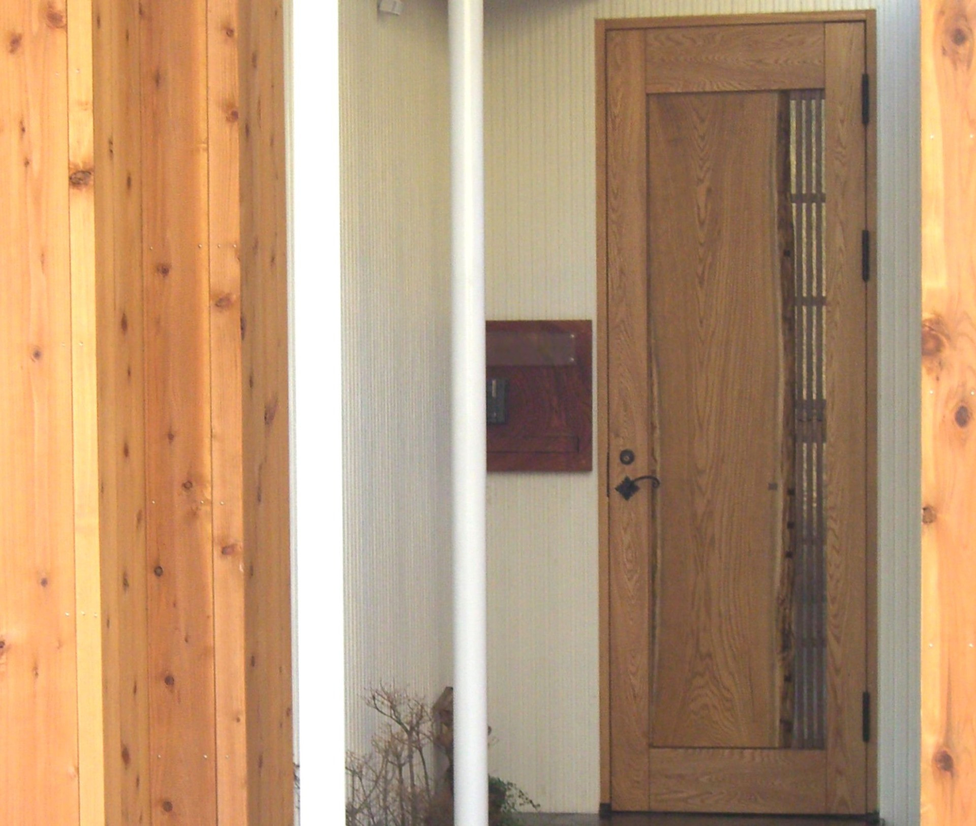 玄関ポーチと玄関ドア(木製 無垢 黄肌材と楢材)